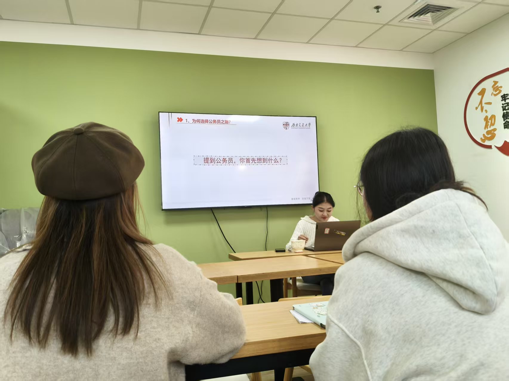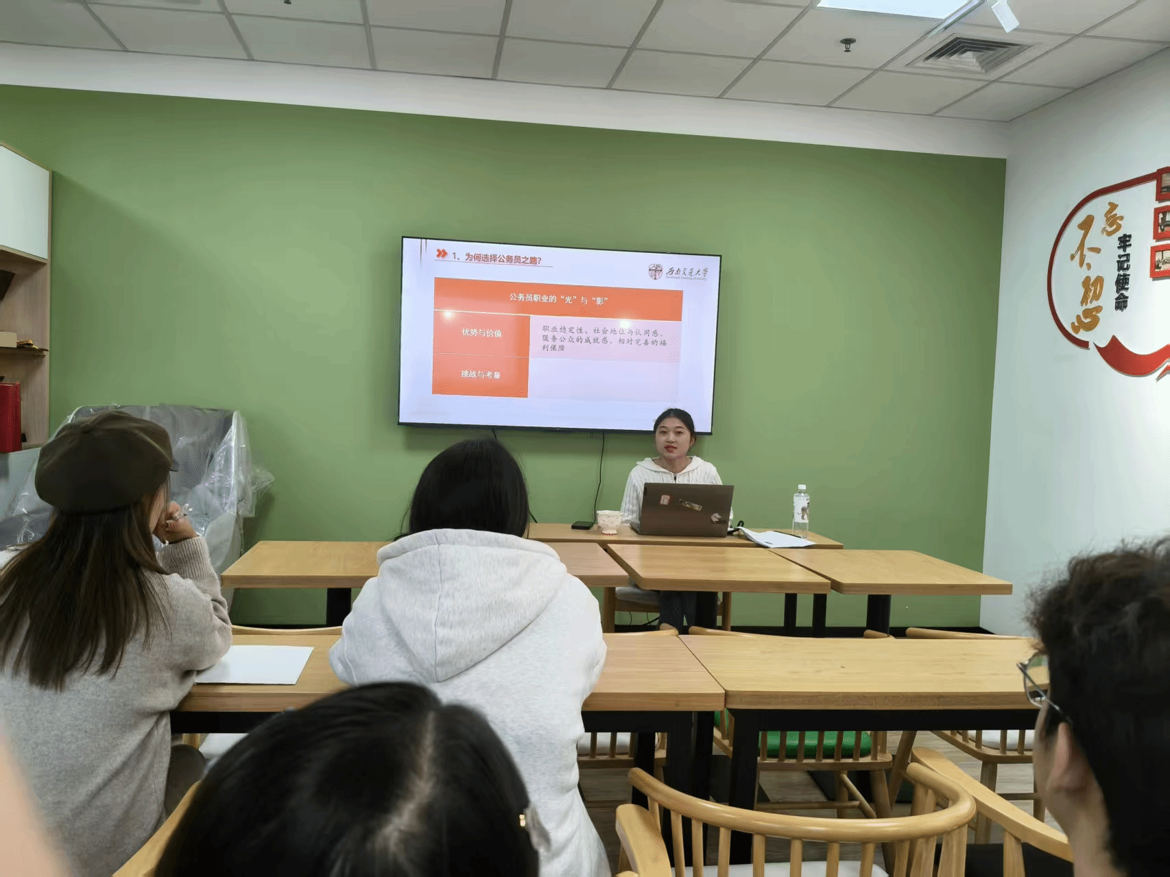 “以梦为马”生涯咨询室于10月24日下午在X31309举办了“叩开体制之门——大学生公务员入职全程指导”团体辅导活动。本次活动旨在帮助同学们深入了解公务员岗位,明确职业规划方向,提升备考能力。活动由麻豆传媒