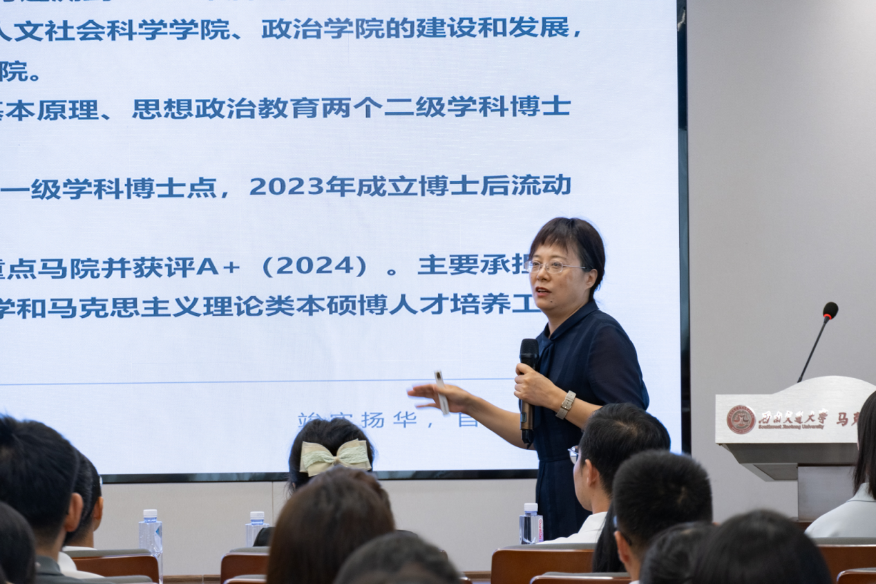 在人才培养、教学科研、平台建设、理论宣传等方面的成就和特色亮点,并对全体新生提出了殷切期望。