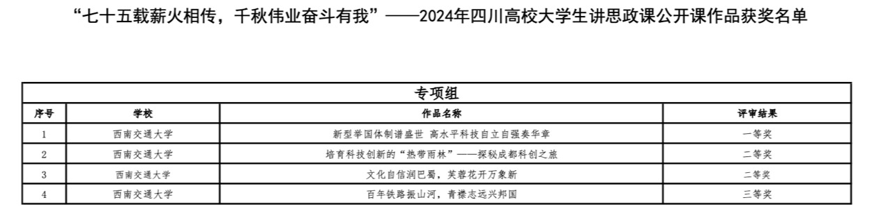 此外,由我院王迎迎老师指导的《百年铁路振山河,青襟志远兴邦国》获四川省三等奖,思想政治教育专业本科生业锦、刘婧雅、张俊岚、彭伊萌、贾思羽、穆媛参与制作。该作品以《思想道德与法治》第三章第二节为依托,巧妙地将铁路发展这一科技主题与爱国主义精神培育深度融合,以“爱国三问”为线索串联起历史与现代,在传授知识的同时,充分利用我校交通强国科学家精神教育基地这一特色资源,使教学更具直观性与感染力,凸显了新时代爱国主义精神在科技领域的体现。