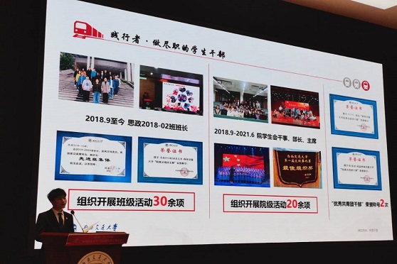 此次评选共有“竢实扬华奖章”(本科生)候选人29名,他们以各自的经历为出发点,用不同的结构和表达方式依次展示了自己的风采。我院本科生张佳旺同学以“做新时代坚定的青年马克思主义者”为主题,从“坚定的学习者”“有力的传播者”“忠诚的践行者”三个方面回首了三年来的奋斗故事,展现出了交大人“竢实扬华、自强不息”的精神和我院优秀学子的风采,赢得了评委的一致好评,最终以24票的成绩在全部参评候选人中排名并列第十一,成为我院本科生第一位“竢实扬华奖章”获得者。