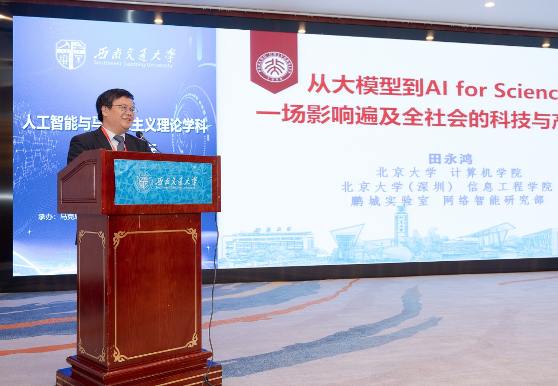 田永鸿教授以《从大模型到AI for Science:一场影响遍及全社会的科技与产业革命》为主题进行了发言。田教授指出,人工智能呈现加速突破、应用驱动的新趋势,正在深刻影响甚至可能从根本上改变科技、经济、社会和安全格局。人工智能促进生产力快速发展的同时,也为社会发展带来了新的挑战,例如,AI高端人才的稀缺与大量重复性劳动岗位被AI替代的矛盾,可能导致社会稳定、贫富差距等问题。在人工智能飞速发展的时代,必须坚持“以人为本”的原则,只有以人为本的AI,才能促进人工智能与社会的和谐发展。