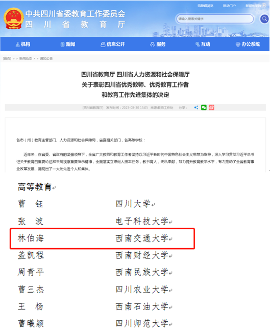 近日,四川省教育厅网站发布了四川省优秀教师、优秀教育工作者和教育工作先进集体表彰对象名单,我院林伯海教授荣获“四川省优秀教师”称号。