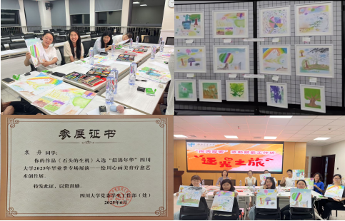 辅导员赵子涵担任导师。首期工作坊中,令狐波带领学员们以“种子的漂流”为主题开展接力绘画创作,帮助学员具象化内心期待,更通过对他人画作的即时解读触发自我认知反思。“个体独特性”与“集体共生性”在这次艺术与心灵的沟通中得到直观呈现,生动诠释了“每个人都是独特星球”的理念。同学们的作品还应邀参加了四川大学“绘川心画”美育疗愈艺术创作展。
