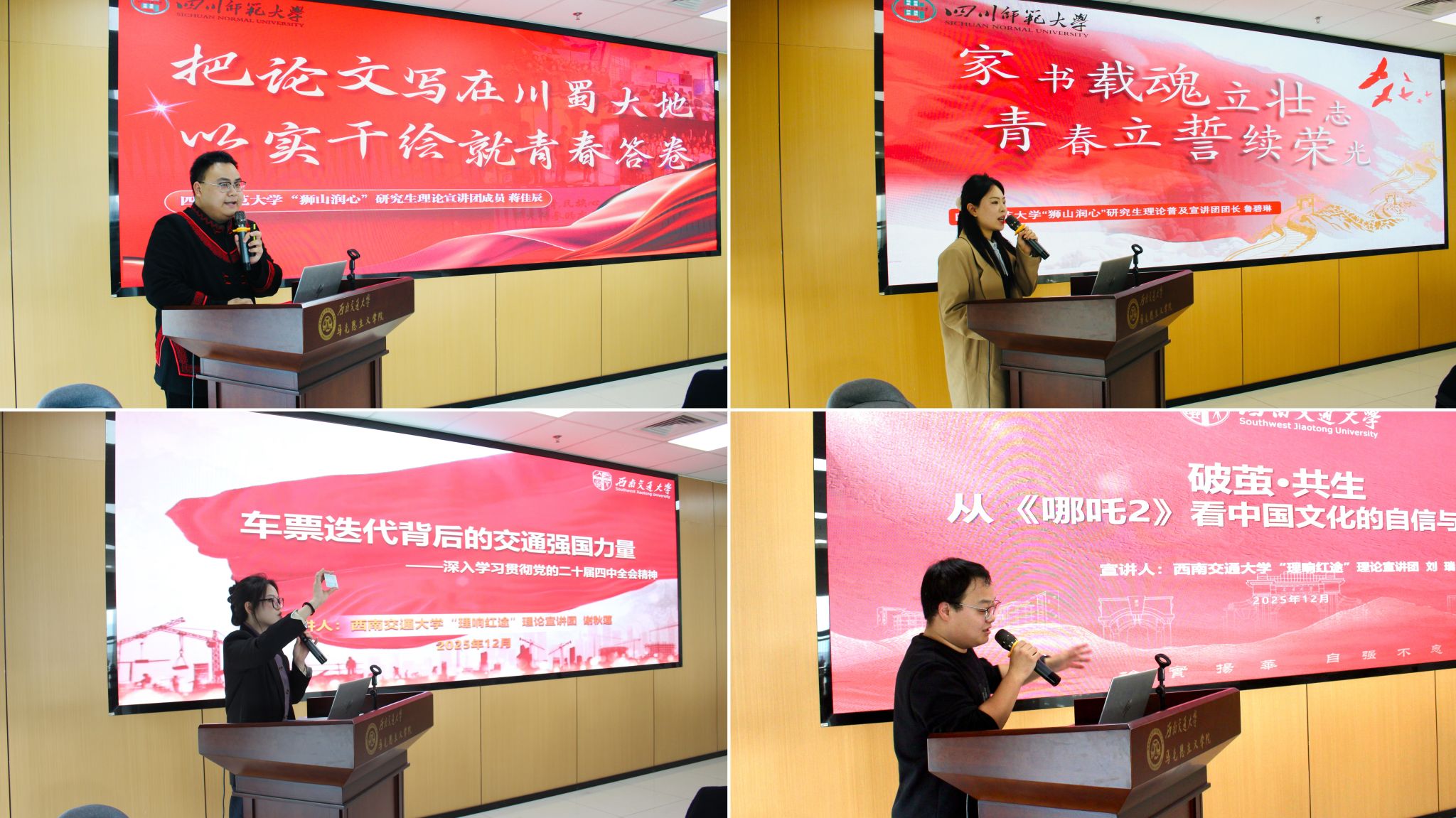 “理响红途”理论宣讲团与四川师范大学“狮山润心”研究生宣讲团共同开展以“理响交融聚合力,狮山红途润同心”为主题的交流共建活动。四川师范大学党委研究生工作部副部长张译丹、专职干部陈铎政,麻豆传媒